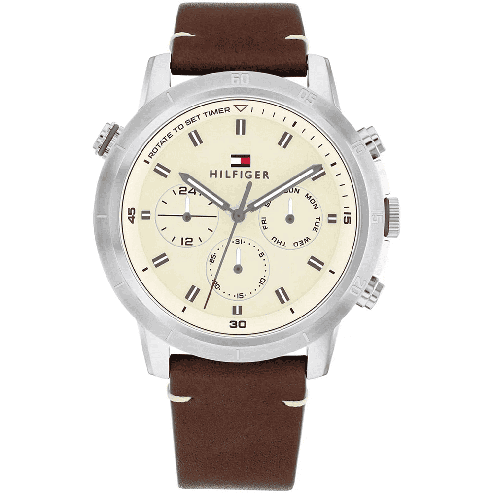 Ανδρικό ρολόι Tommy Hilfiger, κωδ. 1792102, από τη Συλλογή Troy, κατασκευασμένο από ανοξείδωτο ατσάλι με ασημί φινίρισμα και τροφοδοτούμενο από έναν ακριβή μηχανισμό χαλαζία. Το ρολόι διαθέτει μπεζ καντράν με πολυλειτουργικούς υποκαντράν για ημέρα, ημερομηνία και 24 ώρες, εξασφαλίζοντας πρακτικότητα και ευελιξία. Συμπληρώνεται από ένα σκούρο καφέ δερμάτινο λουράκι, με πλάτος 22 mm, που ασφαλίζεται με κούμπωμα με αγκράφα. Η στρογγυλή κάσα των 46 mm έχει πάχος 12 mm, προσφέροντας μια τολμηρή και αρρενωπή εμφάνιση. Με αντοχή στο νερό έως 50 μέτρα (5 ATM), είναι κατάλληλο για καθημερινές δραστηριότητες, όπως η επιφανειακή κολύμβηση. Το ρολόι είναι συσκευασμένο σε αυθεντικό κουτί Tommy Hilfiger, καθιστώντας το ιδανικό δώρο ή πολύτιμη προσθήκη σε οποιαδήποτε συλλογή.