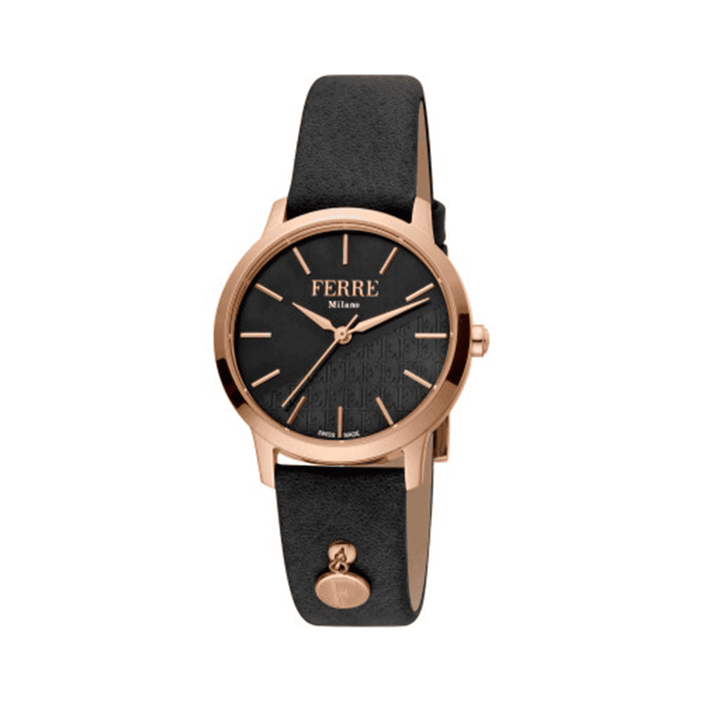 Φέρρε Μιλάνο Ντόννα Σάρα – Γυναικείο ρολόι με ροζ χρυσή κάσα 32 mm, μαύρο καντράν και ορυκτό κρύσταλλο. Μαύρο δερμάτινο λουράκι, ακριβής μηχανισμός quartz. Αντοχή στο νερό 5 ATM, κομψό και κατάλληλο για καθημερινή χρήση.