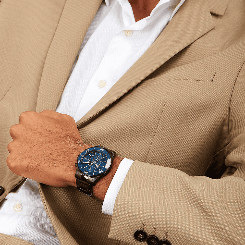 Το ανδρικό ρολόι Maserati, αναφορά R8873600005, από τη συλλογή COMPETIZIONE, συνδυάζει την αθλητική κομψότητα με την τεχνική ακρίβεια, αποτελώντας σύμβολο του πάθους για το σχεδιασμό και την απόδοση. Η στρογγυλή κάσα, κατασκευασμένη από ανοξείδωτο ατσάλι, έχει διάμετρο 43 mm και περιβάλλει ένα ζωντανό μπλε καντράν, διακοσμημένο με εφέ ηλιακών ακτίνων, που δημιουργεί ένα εντυπωσιακό παιχνίδι φωτός. Αυτό προστατεύεται από ένα ανθεκτικό κρύσταλλο Sapphire, σχεδιασμένο να εξασφαλίζει καθαρότητα και μακροχρόνια προστασία από γρατσουνιές. Το ρολόι λειτουργεί με έναν μηχανισμό quartz υψηλής ακρίβειας και διαθέτει λειτουργία χρονογράφου, προσφέροντας τόσο ακρίβεια όσο και επιπλέον λειτουργικότητα. Το βραχιόλι από ανοξείδωτο ατσάλι είναι εξοπλισμένο με κούμπωμα δύτη με ωθητήρα, που εξασφαλίζει άνεση, ασφάλεια και μια εκλεπτυσμένη αθλητική εμφάνιση.
